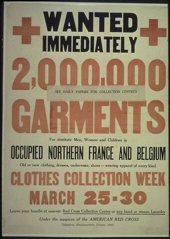 CRB poster requesting clothing donations, 1917-19. By that time, the CRB was aiding northern France as well as Belgium, both areas under military occupation (courtesy National Archives, College Park, via Wikimedia Commons; public domain)