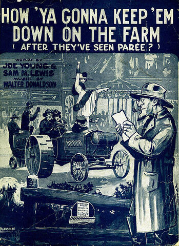 After the Armistice in November 1918, Americans worried that exposure to big, bad Europe would change (corrupt?) their boys. A hit song of 1919 addressed that fear: "How 'Ya Gonna Keep 'Em Down on the Farm (After They've Seen Paree)?" In the song, which strikes a lighthearted mood, a farmer grins slyly as he tells his wife their boy will come back restless, thirsting for what he's glimpsed in France.